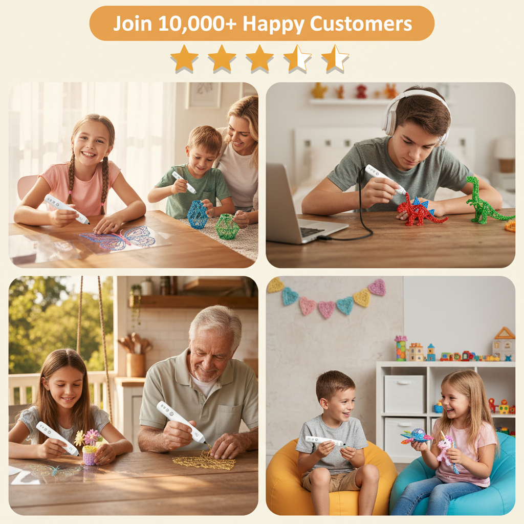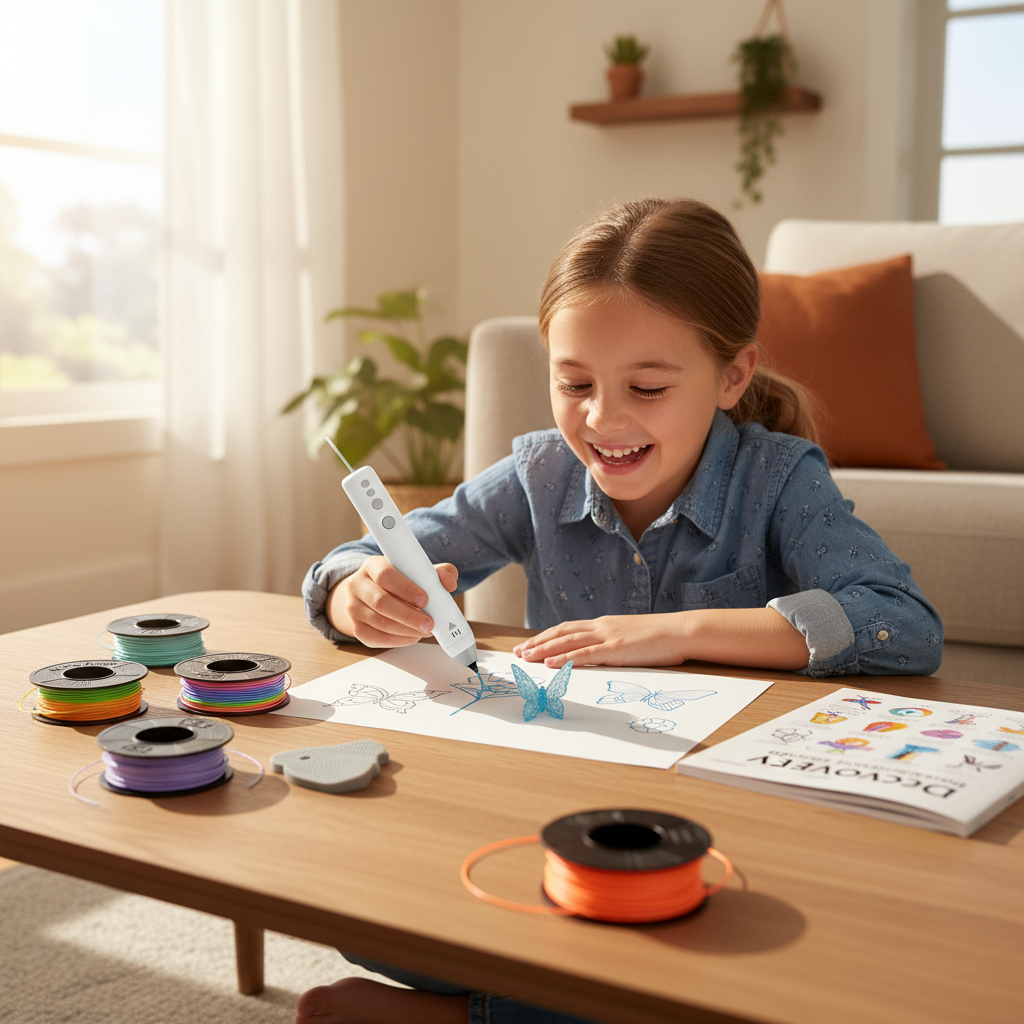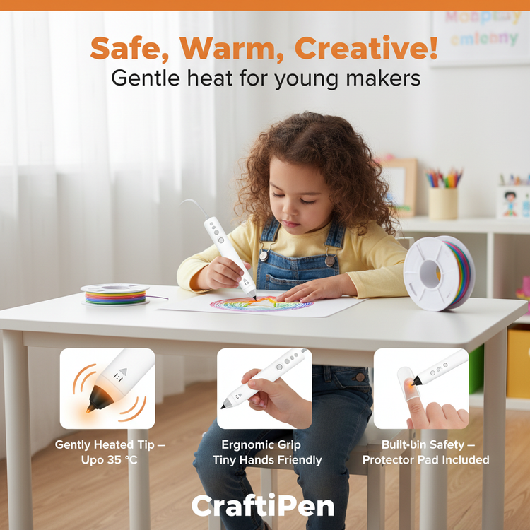 Our pen heats filament to a gentle temperature, ensuring itβs safe to touch and mold. Perfect for children aged 6 and up under parental supervision. Includes finger-protector pads for extra safety and a comfortable grip design thatβs easy for little hands to hold.